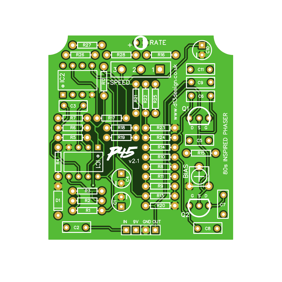 The PCB is designed to fit neatly in a 1590B enclosure with a single hole for the Rate control and an optional LED that flashes in time with the phase.